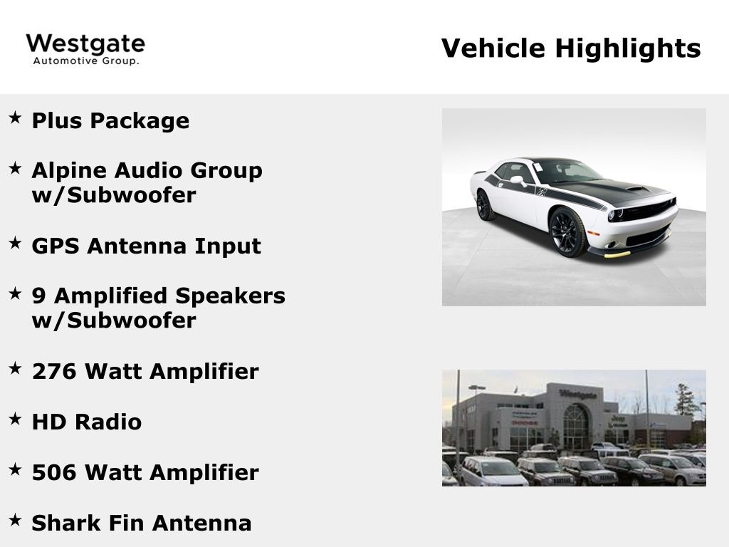 White Knuckle Clearcoat 2023 Dodge Challenger R/T RWD 8-Speed Automatic HEMI 5.7L V8 Multi Displacement VVT 1-Yr SiriusXM Guardian Trial, 276 Watt Amplifier, 4G LTE Wi-Fi Hot Spot, 506 Watt Amplifier, 8.4" Touchscreen Display, 9 Amplified Speakers w/Subwoofer, Alpine Audio Group w/Subwoofer, Apple CarPlay, Black-Edged Premium Floormats, Blind Spot & Cross Path Detection, Body Color Exterior Mirrors, Compass Gauge, Deluxe Security Alarm, Dodge Performance Pages, Door Trim Panel w/Ambient Lighting, Exterior Mirrors w/Heating Element, For Details, Visit DriveUconnect.com, For More Info, Call 800-643-2112, Front Fog Lamps, Google Android Auto, GPS Antenna Input, HD Radio, Heated Front Seats, Heated Steering Wheel, High-Intensity Discharge Headlamps, Integrated Center Stack Radio, Integrated Voice Command w/Bluetooth, Line Lock, Media Hub (2 USB, AUX), Nappa/Alcantara Performance Seats, Plus Package, Power Multi-Function Foldaway Mirrors, Power Tilt/Telescope Steering Column, Premium-Stitched Dash Panel, Radio: Uconnect 4C w/8.4" Display, Radio/Driver Seat/Mirrors Memory, Rhombi Illum Air Catcher Headlamp, Shark Fin Antenna, SiriusXM Radio Service, SiriusXM Satellite Radio, Surround Sound, USB Host Flip, Ventilated Front Seats.