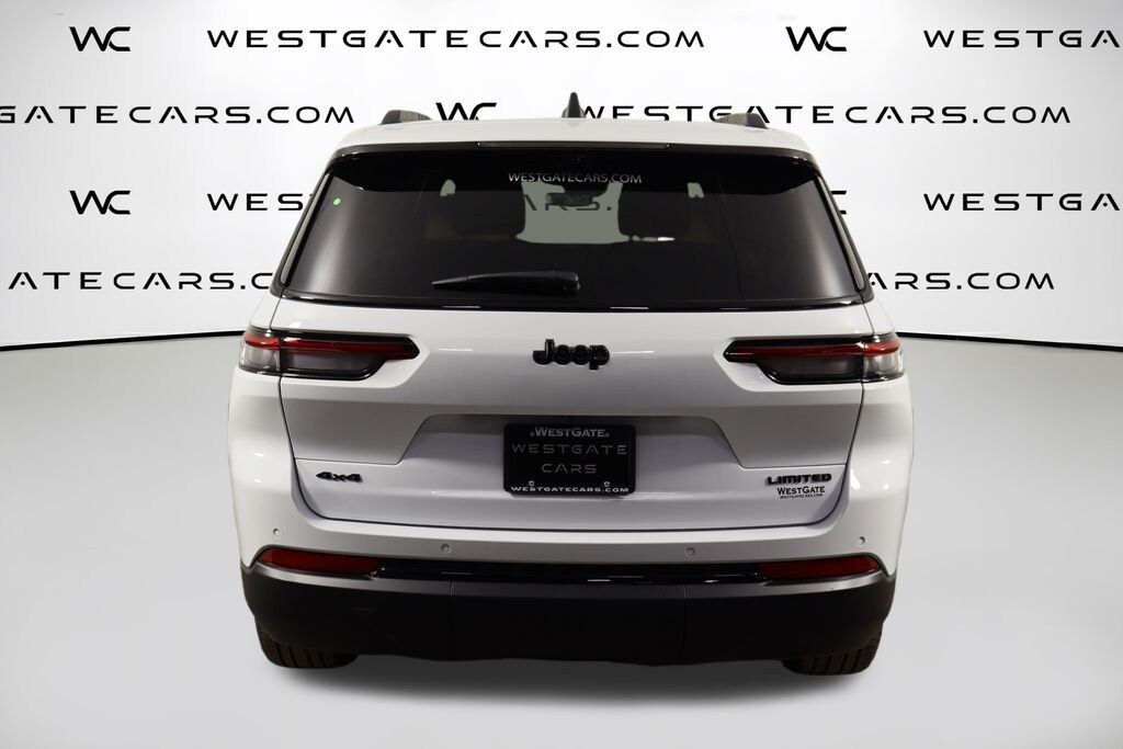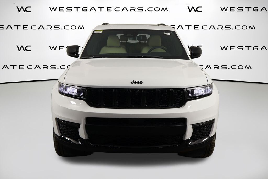 Bright White Clearcoat 2025 Jeep Grand Cherokee L Limited 4WD 8-Speed Automatic 3.6L V6 24V VVT 220 Amp Alternator, 2nd Row Manual Window Shades, 3.45 Rear Axle Ratio, 3rd row seats: split-bench, 4-Wheel Disc Brakes, 506 Watt Amplifier, 6 Speakers, 7 and 4 Pin Wiring Harness, 9 Amplified Speakers with Subwoofer, ABS brakes, Active Noise Control System, Air Conditioning, Alloy wheels, AM/FM radio: SiriusXM with 360L, Anti-whiplash front head restraints, Audio memory, Auto High-beam Headlights, Auto-Dimming Exterior Driver Mirror, Automatic Headlamp Leveling System, Automatic temperature control, Black Appearance Package, Brake assist, Bumpers: body-color, Capri Leatherette Seats, Capri Leatherette with Axis II Seats, Class IV Receiver Hitch, Compass, Delay-off headlights, Driver door bin, Driver vanity mirror, Dual Exhaust Tips, Dual front impact airbags, Dual front side impact airbags, Dual-Pane Panoramic Sunroof, Electronic Stability Control, Emergency communication system, Four wheel independent suspension, Front anti-roll bar, Front Bucket Seats, Front Center Armrest w/Storage, Front dual zone A/C, Front fog lights, Front reading lights, Fully automatic headlights, Garage door transmitter, Gloss Black Exterior Accents, Heated door mirrors, Heated front seats, Heated rear seats, Heated steering wheel, Heavy-Duty Engine Cooling, Illuminated entry, Integrated Off-Road Camera, Interior Rear Facing Camera, Intersection Collision Assist System, Knee airbag, Low tire pressure warning, Luxury Tech Group II, Manual Fold Seatbacks, Memory seat, Memory Steering Column, Model Year Tracking, Navigation System, Normal Duty Suspension, Occupant sensing airbag, Outside temperature display, Overhead airbag, Overhead console, Panic alarm, ParkSense Front/Rear Park Assist with Stop, ParkView Rear Back-Up Camera, Passenger door bin, Passenger vanity mirror, Passive Entry - Front/Rear Doors, Liftgate, Power door mirrors, Power driver seat, Power Liftgate, Power passenger seat, Power steering, Power Tilt/Telescope Steering Column, Power windows, Quick Order Package 23E, Radio data system, Radio: Uconnect 5 Nav with 10.1" Display, Rain Sensitive Windshield Wipers, Rear air conditioning, Rear anti-roll bar, Rear Back Up Camera Washer, Rear Load Leveling Suspension, Rear reading lights, Rear window defroster, Rear window wiper, Rearview Autodim Digital Display Mirror, Reclining 3rd row seat, Remote keyless entry, Security system, Speed control, Speed-Sensitive Wipers, Split folding rear seat, Spoiler, Steering wheel mounted audio controls, Surround View Camera System, Tachometer, Telescoping steering wheel, Tilt steering wheel, Traction control, Trailer Hitch Zoom, Trailer Tow Package, Trip computer, Turn signal indicator mirrors, Variably intermittent wipers, Ventilated Front Seats, Voltmeter, Wheels: 18" x 8.0" Polished/Painted Aluminum, Wheels: 20" x 8.5" Gloss Black Painted Aluminum, Wireless Charging Pad.