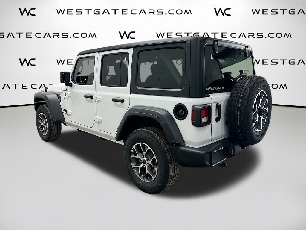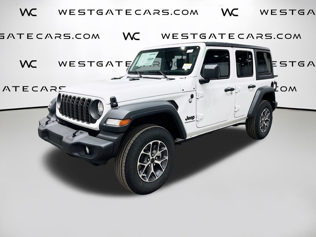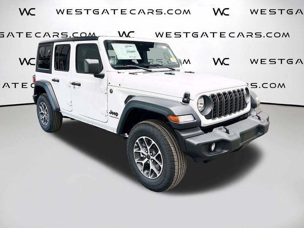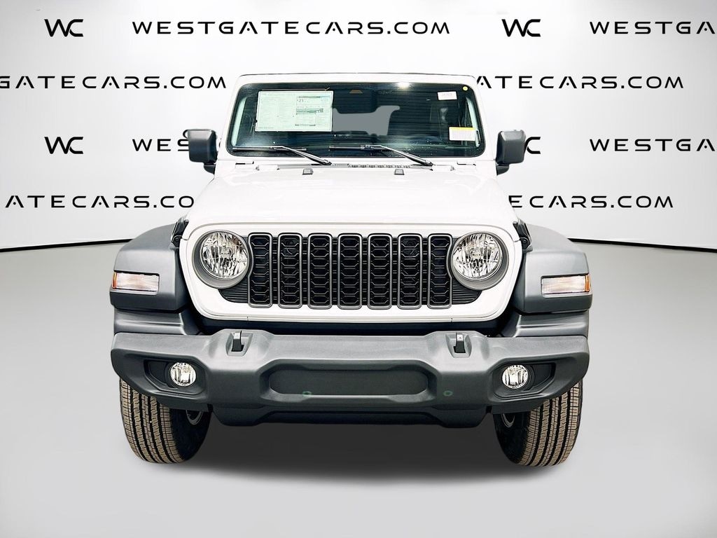 Bright White Clearcoat 2025 Jeep Wrangler Sport S 4WD 8-Speed Automatic 2.0L I4 DOHC 110 MPH Vehicle Max Speed Calibration, 3.45 Overall Top Gear Ratio, 4-Wheel Disc Brakes, 8 Speakers, ABS brakes, Advanced Brake Assist, Air Conditioning, AM/FM radio: SiriusXM, Apple CarPlay/Android Auto, Automatic Headlamps, Aux Battery, Black 3-Piece Hard Top, Brake assist, Cloth Low-Back Bucket Seats, Compass, Corning Gorilla Glass, Deep Tint Sunscreen Windows, Delay-off headlights, Driver door bin, Driver vanity mirror, Dual front impact airbags, Dual front side impact airbags, Electronic Stability Control, Enhanced Adaptive Cruise Control, Freedom Panel Storage Bag, Front anti-roll bar, Front Bucket Seats, Front Center Armrest w/Storage, Front fog lights, Front reading lights, Full Speed Forward Collision Warning Plus, Illuminated entry, Integrated roll-over protection, Low tire pressure warning, Non-Lock Fuel Cap w/o Discriminator, Normal Duty Suspension, Occupant sensing airbag, Outside temperature display, Overhead airbag, Panic alarm, ParkView Rear Back-Up Camera, Passenger door bin, Passenger vanity mirror, Power Heated Mirrors, Power steering, Power windows, Premium Wrapped Steering Wheel, Quick Order Package 22S Sport S, Radio data system, Radio: Uconnect 5 w/12.3" Display, Rear anti-roll bar, Rear reading lights, Rear Window Defroster, Rear Window Wiper/Washer, Remote keyless entry, Security Alarm, Speed control, Split folding rear seat, Steering wheel mounted audio controls, Stop-Start Dual Battery System, Sun Visors w/Illuminated Vanity Mirrors, Tachometer, Telescoping steering wheel, Tilt steering wheel, Traction control, Trip computer, Variably intermittent wipers, Wheels: 17" x 7.5" Black Steel Styled, Wheels: 17" x 7.5" Gray, Wheels: 17" x 7.5" Machined w/Black Pockets.