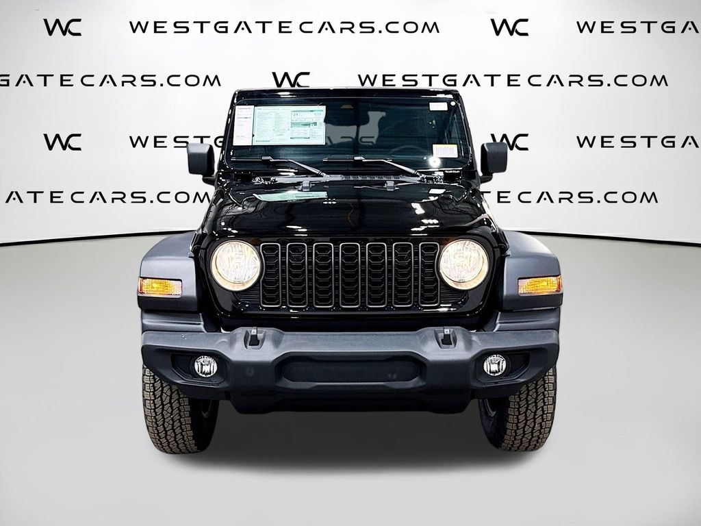Black Clearcoat 2026 Jeep Wrangler Sport S 4WD 8-Speed Automatic 2.0L I4 DOHC 3.45 Overall Top Gear Ratio, 4-Wheel Disc Brakes, 8 Speakers, ABS brakes, Advanced Brake Assist, Air Conditioning, AM/FM radio: SiriusXM with 360L, Apple CarPlay/Android Auto, Automatic Headlamps, Aux Battery, Black 3-Piece Hard Top, Brake assist, Cloth Low-Back Bucket Seats, Compass, Corning Gorilla Glass, Deep Tint Sunscreen Windows, Delay-off headlights, Driver door bin, Driver vanity mirror, Dual front impact airbags, Dual front side impact airbags, Electronic Stability Control, Engine Oil Cooler, Enhanced Adaptive Cruise Control, Freedom Panel Storage Bag, Front anti-roll bar, Front Bucket Seats, Front Center Armrest w/Storage, Front fog lights, Front reading lights, Full Speed Forward Collision Warning Plus, Illuminated entry, Integrated roll-over protection, Low tire pressure warning, MOPAR All-Weather Floor Mats, Non-Lock Fuel Cap w/o Discriminator, Normal Duty Suspension, Occupant sensing airbag, Outside temperature display, Overhead airbag, Panic alarm, ParkView Rear Back-Up Camera, Passenger door bin, Passenger vanity mirror, Power Heated Mirrors, Power steering, Power windows, Premium Wrapped Steering Wheel, Quick Order Package 22S Sport S, Radio data system, Radio: Uconnect 5 w/12.3" Display, Rear anti-roll bar, Rear reading lights, Rear Window Defroster, Rear Window Wiper/Washer, Remote keyless entry, Security Alarm, Speed control, Split folding rear seat, Steering wheel mounted audio controls, Stop-Start Dual Battery System, Sun Visors w/Illuminated Vanity Mirrors, Tachometer, Telescoping steering wheel, Tilt steering wheel, Traction control, Trip computer, Variably intermittent wipers, Wheels: 17" x 7.5" Black Steel Styled, Wheels: 17" x 7.5" Gray.