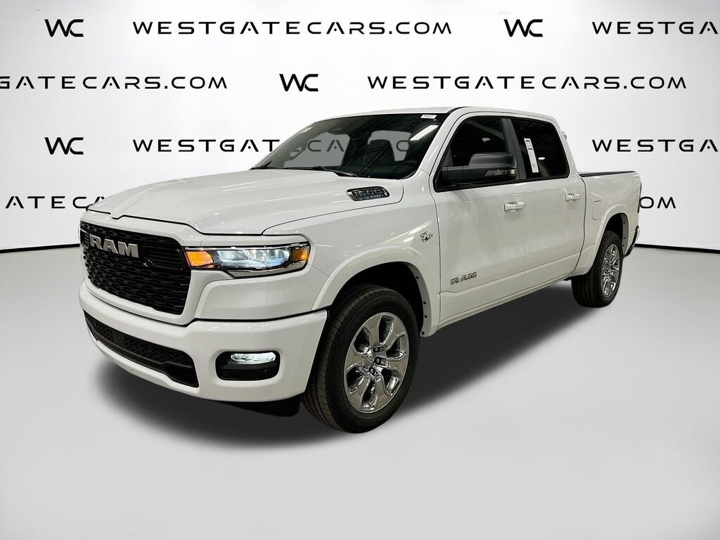Bright White Clearcoat 2026 Ram 1500 Big Horn/Lone Star 4WD 8-Speed Automatic HEMI 5.7L V8 Multi Displacement VVT eTorque 115V Auxiliary Power Outlet, 2nd Row in Floor Storage Bins, 3 Rear Seat Head Restraints, 33 Gallon Fuel Tank, 4 Way Front Headrests, 4-Wheel Disc Brakes, 400W Inverter, 48V Belt Starter Generator, 4G LTE Wi-Fi Hot Spot, 6 Speakers, ABS brakes, Air Conditioning, Alloy wheels, AM/FM radio, Apple CarPlay, Apple CarPlay/Android Auto, Auto High-beam Headlights, Auto Power-Folding Mirrors, Auto-Dimming Exterior Driver Mirror, Auto-Dimming Rear-View Mirror, Big Horn Level 1 Equipment Group, Black Exterior Mirrors, Black Interior Accents, Black Premium Power Mirrors, Body Color Door Handles, Body Color Fender Flares, Body Color Front Bumper, Body Color Rear Bumper with Step Pads, Body Color Tailgate Handle, Brake assist, Bucket Seats, Bumpers: chrome, Center Console Parts Module, Cloth Bucket Seats, Compass, Connectivity - US/Canada, Convex Wide-Angle Exterior Mirror Insert, Delay-off headlights, Deluxe Cloth Bucket Seats, Driver door bin, Dual front impact airbags, Dual front side impact airbags, Electronic Stability Control, Exterior Mirrors Courtesy Lamps, Exterior Mirrors with Heating Element, Exterior Mirrors with Supplemental Signals, Front anti-roll bar, Front Bucket Seats, Front Center Armrest w/Storage, Front fog lights, Front reading lights, Front Seat Back Map Pockets, Front wheel independent suspension, Full Length Floor Console, Fully automatic headlights, Global Telematics Box Module, Glove Box Lamp, Google Android Auto, GPS Antenna Input, Grille Surround 1 Body Color Texture 1 Black, Heated door mirrors, Heated Front Seats, Heated Steering Wheel, Illuminated entry, Integrated Center Stack Radio, Integrated Voice Command with Bluetooth, Leather Wrapped Steering Wheel, Low tire pressure warning, Manual Adjust 4-Way Driver Seat, Manual Adjust 4-Way Front Passenger Seat, Manual Folding Exterior Mirrors, Occupant sensing airbag, Outside temperature display, Overhead airbag, Overhead console, Panic alarm, ParkView Rear Back-Up Camera, Passenger door bin, Passenger vanity mirror, Power 2-Way Driver Lumbar Adjust, Power Adjust 8-Way Driver Seat, Power Adjustable Pedals, Power door mirrors, Power steering, Power windows, Quick Order Package 27Z Big Horn, Radio data system, Radio: Uconnect 5 W with 8.4" Display, RAM Grille Badge - Chrome, Rear 60/40 Folding Seat, Rear anti-roll bar, Rear Center Armrest, Rear Dome with on/Off Switch Lamp, Rear Power Sliding Window, Rear step bumper, Rear Window Defroster, Remote keyless entry, SiriusXM Radio Service, SiriusXM Satellite Radio, Speed control, Sport Appearance Package, Steering Wheel Mounted Audio Controls, Sun Visors with Illuminated Vanity Mirrors, Supplier Part Tracking (J-1), Tachometer, Telescoping steering wheel, Tilt steering wheel, Traction control, Trip computer, Universal Garage Door Opener, USB Host Flip, Variably intermittent wipers, Voltmeter, Wheels: 20" x 9" Aluminum Chrome Clad.