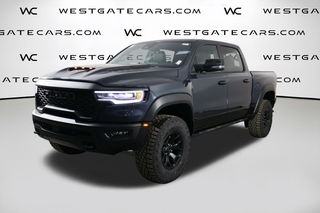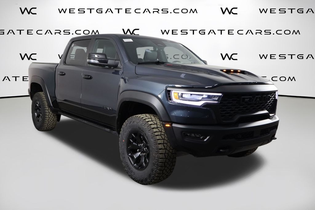 Forged Blue Metallic 2026 Ram 1500 RHO 4WD 8-Speed Automatic 3.0L I6 10 Speakers, 12-Way/1-Way Trailer Connector, 14.4" Touchscreen Display, 240 Amp Alternator, 3.92 Rear Axle Ratio, 4-Wheel Disc Brakes, 4G LTE Wi-Fi Hot Spot, ABS brakes, Adaptive suspension, Adjustable pedals, Air Conditioning, Alloy wheels, AM/FM radio, Apple CarPlay/Android Auto, Auto High-beam Headlights, Auto Power-Folding Mirrors, Auto-dimming door mirrors, Auto-Dimming Exterior Driver Mirror, Auto-dimming Rear-View mirror, Automatic temperature control, Bed Utility Group, Brake assist, Compass, Connected Travel and Traffic Services, Connectivity - US/Canada, Delay-off headlights, Disassociated Touchscreen Display, Dome Dual LED Reading Lamp, Driver door bin, Driver Power Seat Back Massage, Driver Seat Memory, Driver vanity mirror, Driver/Passenger Wrapped Assist Handles, Drowsy Driver Detection, Dual front impact airbags, Dual front side impact airbags, Dual Wireless Charging Pad, Dual-Pane Panoramic Sunroof, Electronic Stability Control, Evasive Steer Assist, Exterior 115V AC Outlet, Exterior Mirrors Courtesy Lamps, Exterior Mirrors with Heating Element, Exterior Mirrors with Memory, Exterior Mirrors with Supplemental Signals, Exterior Parking Camera Rear, Flareside Box, Front anti-roll bar, Front Bucket Seats, Front Center Armrest w/Storage, Front dual zone A/C, Front fog lights, Front Passenger Interactive Display, Front Passenger Power Seat Back Massage, Front reading lights, Front wheel independent suspension, Full Length Premium Upgraded Floor Console, Fully automatic headlights, Garage door transmitter, GPS Navigation, Hands-Free Active Driving Assist System, Harman/Kardon 19 Speaker Premium Sound, HD Radio, Heads-Up Display, Heated door mirrors, Heated front seats, Heated Second Row Seats, Heated steering wheel, Illuminated entry, Integrated Center Stack Radio, Integrated Voice Command with Bluetooth, Intersection Collision Assist System, Leather Shift Knob, Leather steering wheel, Leather Trimmed Bucket Seats, Leather/Carbon Flat-Bottom Steering Wheel, LED CHMSL Lamp, Low tire pressure warning, Luxury Front Door Trim Panel, MOPAR 4 Adjustable Cargo Tie-Down Hooks, MOPAR Deployable Bed Step, MOPAR Rock Rails, Navigation System, Occupant sensing airbag, Outside temperature display, Overhead airbag, Overhead console, Panic alarm, Passenger door bin, Passenger vanity mirror, Power Adjustable Pedals with Memory, Power door mirrors, Power driver seat, Power passenger seat, Power steering, Power Tailgate, Power windows, Premium Wrapped Instrument Panel Bezel, Quick Order Package 22Y RHO, Radio data system, Radio: Uconnect 5 Nav with 14.4" Display, Radio: Uconnect 5 Navigation with 12.0" Display, Radio/Driver Seat/Mirrors/Pedals Memory, Rain Sensitive Windshield Wipers, Real Carbon Fiber Interior Accents, Rear 60/40 Folding Split Recline Seat, Rear reading lights, Rear seat center armrest, Rear step bumper, Rear window defroster, Remote keyless entry, RHO Level 1 Equipment Group, Security system, SiriusXM Radio Service, Smartphone as a Key Capable, Speed control, Split folding rear seat, Sport steering wheel, Steering wheel mounted audio controls, Surround View Camera System, Tachometer, Telescoping steering wheel, Tilt steering wheel, Traction control, Traffic Sign Recognition, Trip computer, Turn signal indicator mirrors, USB Host Flip, Variably intermittent wipers, Ventilated Front Seats, Ventilated Rear Seats, Voltmeter, Wheels: 18" x 9" Black Paint/Polish Aluminum.