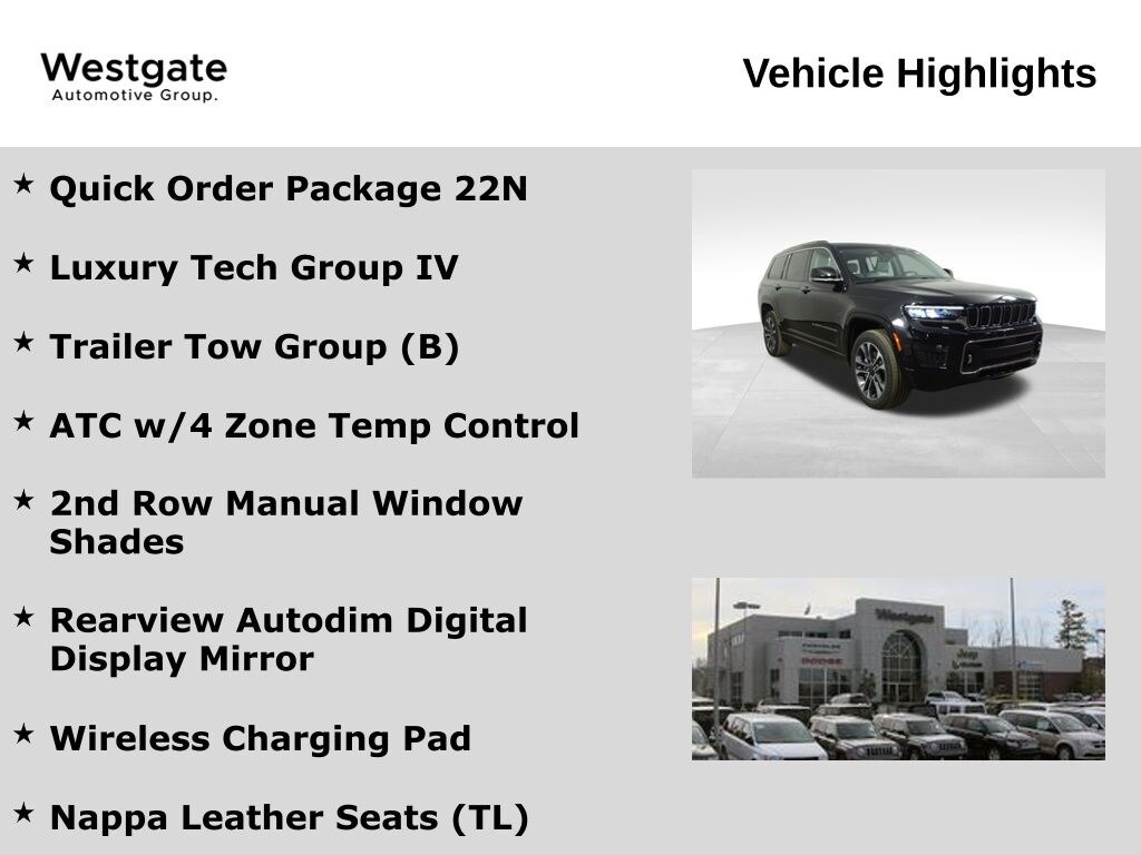 2nd Row Manual Window Shades, ATC w/4 Zone Temp Control, Driver Power Seat Back Massage, Front Passenger Power Seat Back Massage, Luxury Tech Group IV, Nappa Leather Seats (TL), Passenger Seat Memory, Power Adjust 12-Way Driver Seat, Power Adjust 12-Way Front Passenger Seat, Quick Order Package 22N, Rearview Autodim Digital Display Mirror, Trailer Hitch Zoom, Trailer Tow Group (B), Wireless Charging Pad, 10 Speakers, 10.1" Touchscreen Display, 19 Speakers High Performance Audio, 3.45 Rear Axle Ratio, 3rd row seats: split-bench, 4-Wheel Disc Brakes, 950 Watt Amplifier, ABS brakes, Adaptive suspension, Air Conditioning, Air Susp/Activ Damping Delete Credit, Alloy wheels, AM/FM radio: SiriusXM w/360L, Anti-whiplash front head restraints, Apple CarPlay, Apple CarPlay/Android Auto, Audio memory, Auto High-beam Headlights, Auto-dimming door mirrors, Auto-dimming Rear-View mirror, Auto-leveling suspension, Automatic temperature control, Aux Battery, Brake assist, Bumpers: body-color, Compass, Connected Travel & Traffic Services, Connectivity - US/Canada, Delay-off headlights, Disassociated Touchscreen Display, Driver door bin, Driver vanity mirror, Dual front impact airbags, Dual front side impact airbags, Electronic Stability Control, Emergency communication system, Four wheel independent suspension, Front anti-roll bar, Front Bucket Seats, Front Center Armrest w/Storage, Front dual zone A/C, Front fog lights, Front License Plate Bracket (DISC), Front reading lights, Fully automatic headlights, Garage door transmitter, Google Android Auto, GPS Antenna Input, GPS Navigation, HD Radio, Heated door mirrors, Heated front seats, Heated rear seats, Heated steering wheel, Illuminated entry, Integrated Center Stack Radio, Integrated Voice Command w/Bluetooth, Knee airbag, Leather steering wheel, Low tire pressure warning, Memory seat, Nappa Leather Seats, Navigation System, Normal Duty Suspension, Occupant sensing airbag, Outside temperature display, Overhead airbag, Overhead console, Panic alarm, ParkView Rear Back-Up Camera, Passenger door bin, Passenger vanity mirror, Power door mirrors, Power driver seat, Power Fold Seatbacks, Power Liftgate, Power moonroof: CommandView, Power passenger seat, Power steering, Power windows, Radio data system, Radio: Uconnect 5 Nav w/10.1" Display, Radio: Uconnect 5 Nav w/8.4" Display, Rain sensing wipers, Rear air conditioning, Rear anti-roll bar, Rear reading lights, Rear window defroster, Rear window wiper, Reclining 3rd row seat, Remote keyless entry, Roof rack: rails only, Security system, SiriusXM Satellite Radio, SiriusXM w/360L, Speed control, Speed-Sensitive Wipers, Split folding rear seat, Spoiler, Steering wheel memory, Steering wheel mounted audio controls, Tachometer, Telescoping steering wheel, Tilt steering wheel, Traction control, Trip computer, Turn signal indicator mirrors, USB Host Flip, Variably intermittent wipers, Ventilated front seats, Voltmeter, Wheels: 20" x 8.5" Machined Face Aluminum, 2nd Row Manual Window Shades, ATC w/4 Zone Temp Control, Driver Power Seat Back Massage, Front Passenger Power Seat Back Massage, Luxury Tech Group IV, Nappa Leather Seats (TL), Passenger Seat Memory, Power Adjust 12-Way Driver Seat, Power Adjust 12-Way Front Passenger Seat, Quick Order Package 22N, Rearview Autodim Digital Display Mirror, Trailer Hitch Zoom, Trailer Tow Group (B), Wireless Charging Pad.